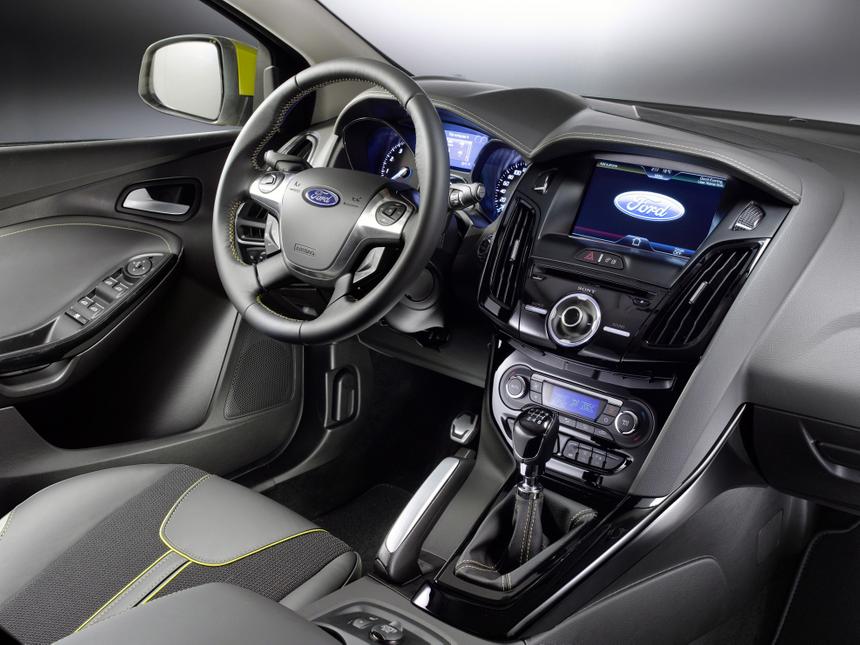 Ford Focus, салон которого всегда отличался отточенной эргономикой качественными материалами отделки, в соответствии с комплектацией может быть «спартанским» с простым монохромным экраном, или, в топовых версиях, максимально «заряженным» всевозможными опциями и техническими новинками. Но, как говорилось выше, высокое качество сборки и отделки, присуще абсолютно всем версиям. Ford Focus, размеры салона которого достаточно просторны для того чтобы комфортно разместить водителя и четырех пассажиров, предлагается в четырех вариантах комплектации: Ambiente, Trend, Trend Sport и Titanium. Самая скромная Ambiente комплектуется электроусилителем руля, двумя фронтальными подушками безопасности, АБС, передними стеклоподъемниками и электроприводом зеркал, лифтом водительского сидения, а так же регулируемой по высоте и вылету рулевой колонкой. Форд Фокус в этой комплектации имеет маломощный, но экономичный двигатель объемом 1,6-литра, агрегатированного с пятиступенчатой механической коробкой передач. Расход топлива Форд Фокуса в этой комплектации, составляет менее шести литров бензина на сто километров. Несмотря на экономичность и невысокую стоимость, продажи этой комплектации не велики. По статистике россияне предпочитают красивые автомобили с максимальной внутренней начинкой, поэтому более 40% продаж приходится на долю топовой версии Titanium. Салон Форд Фокус этой версии просто поражает количеством всевозможных опций, особенно если учесть тот факт, что мы имеем дело с недорогим автомобилем гольф-класса. «Заряженная» версия может похвастаться кожаным салоном, шестью электрорегулировками водительского кресла, автоматической системой парковки и парктроником, активным би-ксеноновым светом, светодиодной подсветкой салона, имеющей семь различных цветов, системами круиз-контроля и мониторинга слепых зон, лобовым стеклом с электроподогревом, аудиосистемой Sony CD MP3 USB AUX Bluetooth с пятидюймовым цветным экраном, навигатором на передней панели с четырехдюймовым жидкокристаллическим дисплеем, боковыми шторками безопасности и семнадцатидюймовыми легкосплавными колесными дисками. В этой комплектации Форд Фокус, характеристики которого могут соперничать даже с «навороченными» седанами премиум-класса, комплектуется двухлитровым двигателем мощностью 150 лошадиных сил, который обеспечивает Форд Фокусу разгон до ста километров всего за девять секунд.