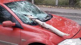 Высохшее дерево упало на дорогу и проткнуло автомобиль насквозь
