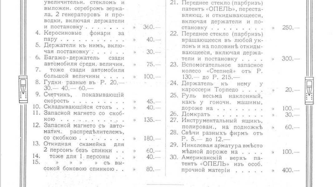 Эксклюзив Quto: цены на автомобили и допоборудование Opel в России в 1911 году