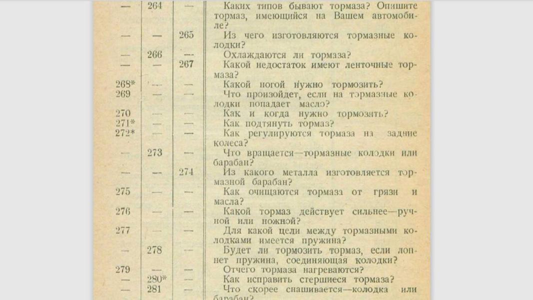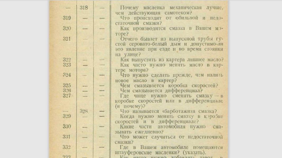 Тем же, кто действительно хотел работать водителем, предстояло непростое испытание. Это сейчас для получения прав достаточно ответить на 20 вопросов ГИБДД. Но столетие назад теоретический блок состоял из нескольких десятков вопросов, причём все они касались технического оснащения автомобилей и устранения неполадок. Скажем честно: мы с заданием не справились.