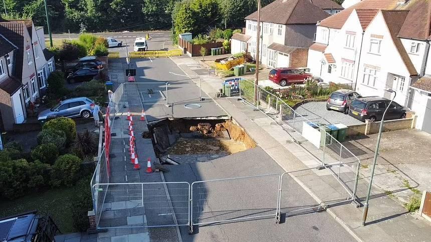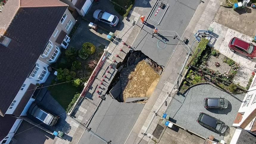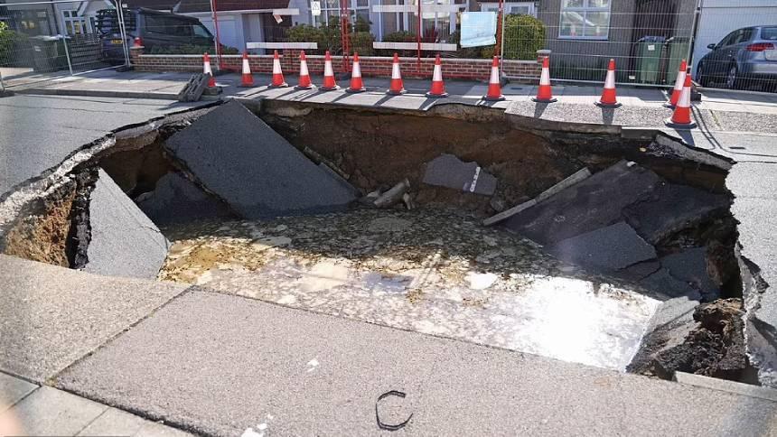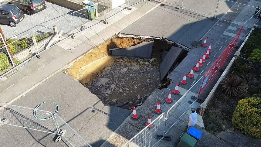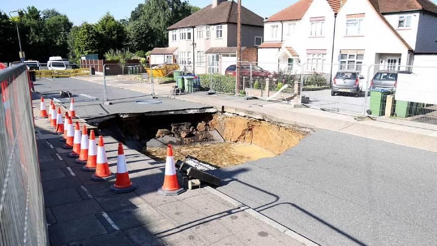 На одной из улиц в южной части города образовался крупный провал асфальта.Огромная воронка шириной около 6 метров и глубиной чуть менее 5 метров образовалась в лондонском пригороде Бекслихет. По словам очевидцев, в это время по улице проезжал мотоциклист, который не успел среагировать на опасность. Очевидны сообщают, что со стороны могло показаться, что 49-летний Мик Стивенс пытается перепрыгнуть провал, однако закончилось всё неудачно. Впрочем, серьёзных травм райдер не получил и даже смог самостоятельно выбраться на поверхность.