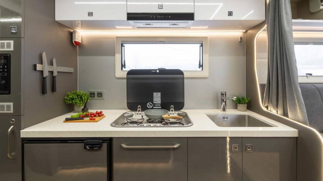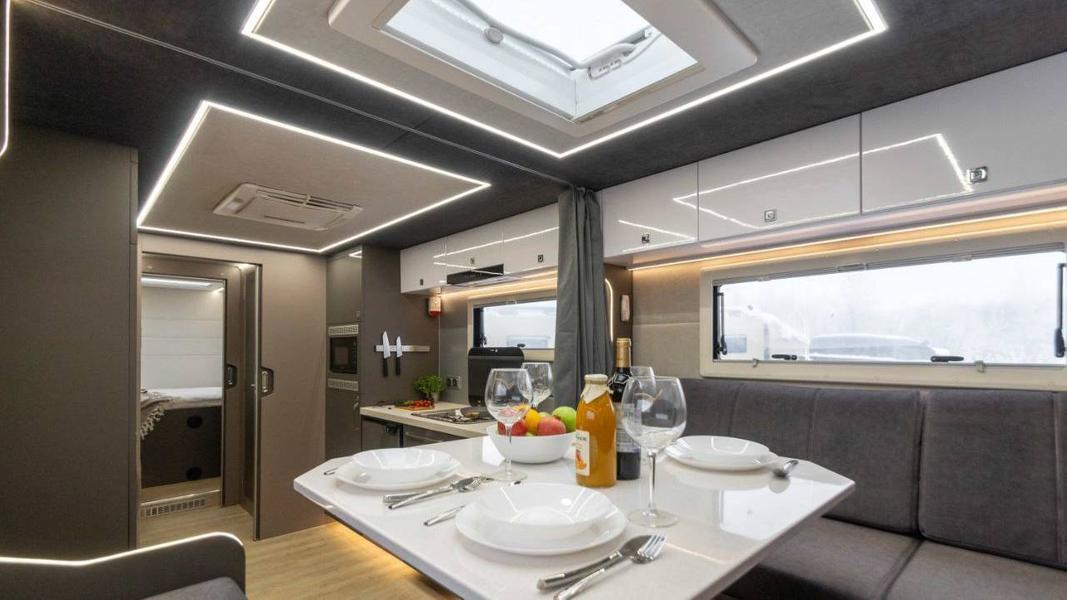 В отделке стен и потолка кемпера используется ткань. Производитель также отмечает, что здесь предусмотрен большой запас воды и энерговооружённость.