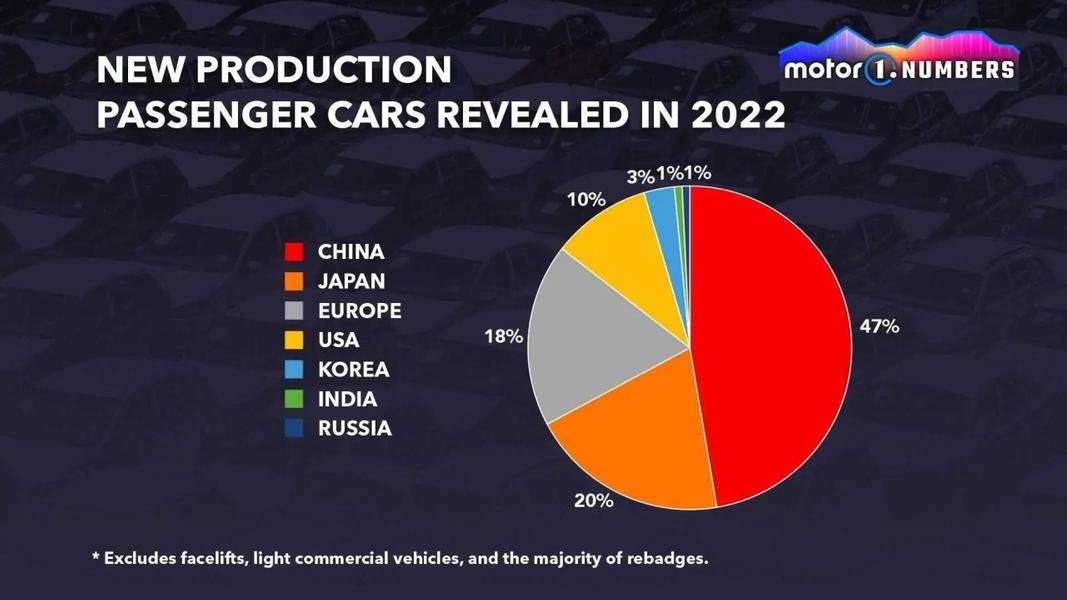 В среднем на рынок выходило по пять новинок в месяцПо подсчётам издания Motor1, по всему миру в 2022 году поступила в продажу 131 совершенно новая модель легковушек. На китайские новинки пришлось 47% из общего числа. Япония оказалась на втором месте с долей в 20%, а Европа – на третьем месте с показателем 18%. Далее расположились США (10%) и Южная Корея (3%). Замыкают список Индия и Россия с долей серийных новинок по 1%. Наибольшее число премьер пришлось на китайский концерн SAIC, который выпустил в продажу 10 абсолютно новых машин. За ним идут Geely (восемь новинок) и Great Wall (шесть моделей).