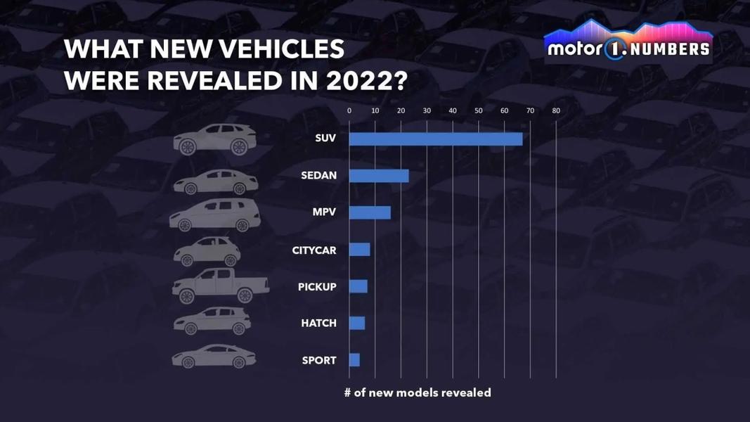 На долю кроссоверов и внедорожников пришёлся 51% всех новинок 2022 года. Представлено 67 моделей этого типа. Лидерами в классе по числу премьер стали SAIC, Geely, Honda и Stellantis. Седанов было представлено 23, из них 12 продаются исключительно в Китае. Третьими по популярности оказались минивэны: в продажу поступило 16 новинок. Половина из них также продаётся лишь в Китае. Городских машин вышло восемь, пикапов – семь, хэтчбеков – шесть, спорткаров – четыре (Ford Mustang, GAC Aion Hyper SSR, Pagani Utopia и Rolls-Royce Spectre).