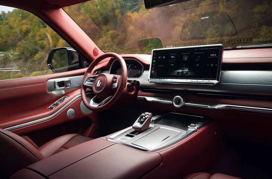 Только такой Tank 700 доступен в России с гибридной силовой установкой: два блока батарей общей емкостью 37,1 кВт·ч можно заряжать от розетки и проезжать на чистой электротяге до 100 километров. Хотя этот сценарий вряд ли можно считать основным — единственный 163-сильный электромотор здесь встроен в корпус девятиступенчатого «автомата» и больше предназначен для помощи трехлитровому V6 с двойным турбонаддувом, чем для использования в режиме соло.