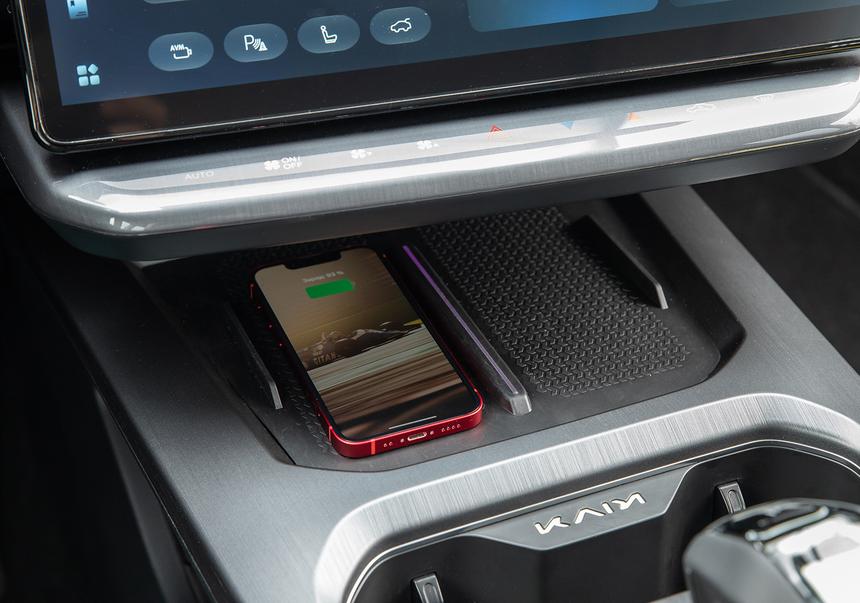 Позаботились здесь не только о водителе, но и пассажире. Здесь есть два слота под смартфоны (один их них с беспроводной зарядкой), разделённых тонкой диодной линией, а подогрев и вентиляция есть в обоих передних сиденьях.