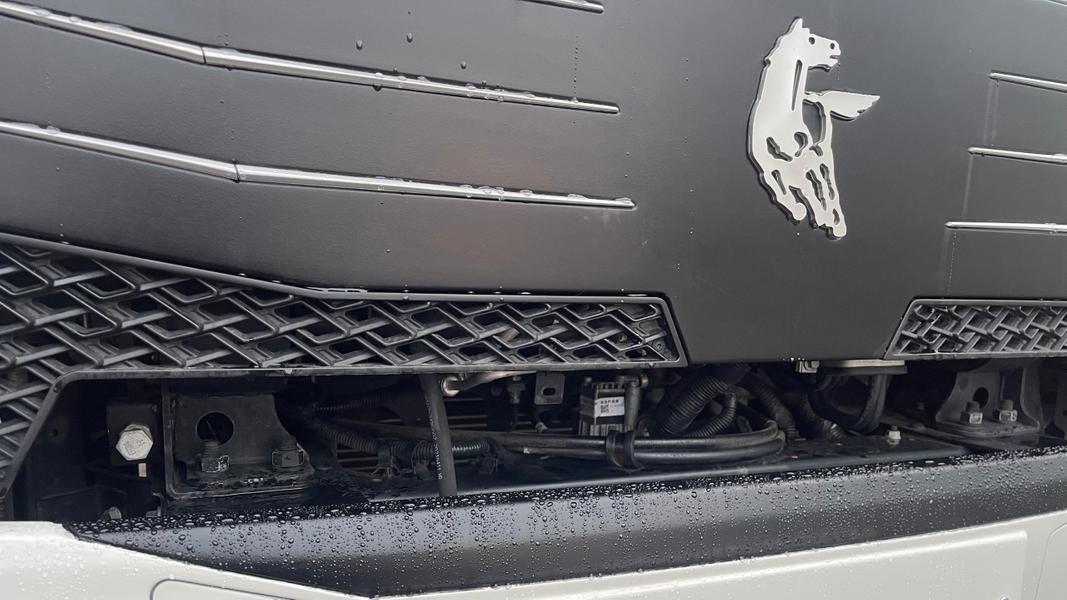 Также странным решением выглядит широкая щель между фальшрадиаторной маской и передним бампером. Туда будет забиваться снег, попадать грязь и заливаться дождевая вода. Это наверняка не слишком понравится блокам управления и электрической проводке... Последняя, кстати, местами проложена нелогично: «шланги» буквально свисают под рамой. И фильтр-сепаратор, открытый всем ветрам, тоже стоило бы расположить иначе.