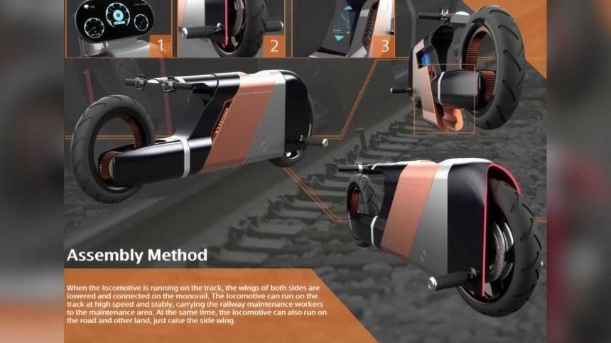 Переднеприводный байк оборудован кузовом-трансформером и мотор-колесом.По замыслу автора, модель подойдёт для рабочих, которые обслуживают рельсы. Предполагается, что на двухколёсном транспортном средстве бригады смогут быстрее добираться до участка, требующего ремонта.