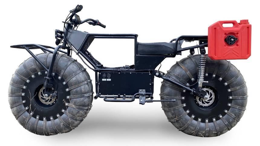 Байк оборудован огромными колесами и полным приводом.Габаритная длина новинки составляет 2100 мм, высота 1040 мм, высота сиденья — 750 мм. Весит байк 60,7 кг, но это без учета источников питания.