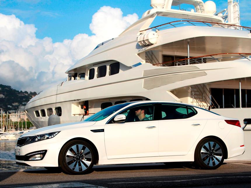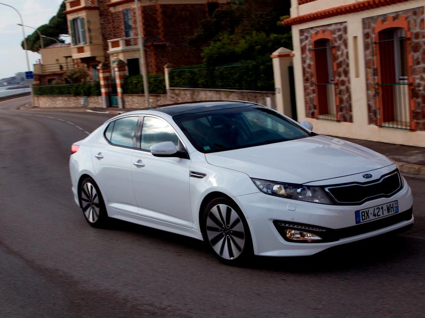 Презентация новой KIA Optima произошла в Нью-Йорке в 2010 году. Российские продажи её начались спустя два года. Модель 2011 года имеет общую платформу с Hyundai Sonata IV генерации. «КИА» впечатляет своим стремительным силуэтом и сложносочинёнными фарами. Фотогеничная KIA Optima хороша с разных ракурсов. Менеджеры сделали упор на внешности, тем самым выведя «кореянку» в ранг авто бизнес-класса. Перламутровый оттенок Snow White Pearl визуально расширяет и без того немаленькие габариты седана: длина его на 61 мм больше, чем у Ford Mondeo. В доступе имеются различные цвета «КИА Оптима»: от таинственного Santorini Blue до жизнеутверждающего Spicy Red. Внутреннее убранство не настолько эмоционально. В зависимости от комплектации и цены, предлагаются различные варианты организации интерьера. Самые упакованные авто располагают кожаной обивкой сидений, электроприводом водительского кресла. Топ-версия «Премиум» оснащена навигацией, подогревом заднего дивана. Камера заднего вида даёт неплохой обзор, а парктроник решает проблему с парковкой. Всё это удовольствие обойдётся в 1 319 900 рублей. Модель 2012 года «начинена» сюрпризами, такими как развёрнутая к водителю центральная консоль, дисплей комбинации приборов с информацией о положении передних колёс. Базовая комплектация подразумевает тканевую обивку салона, наличие ABS, шести подушек безопасности, двухзонного климат-контроля. Официальная цена начинается с 939 900 рублей за версию «Комфорт» с шестиступенчатой «механикой». Назначив подобную стоимость, корейцы не озаботились созданием системы стабилизации. Столько, сколько стоит «КИА Оптима», разумнее заплатить за Mazda 6 в исполнении Touring Plus. Тем более, расход топлива у последней меньше. А технические характеристики схожи. Под капотом у «КИА» трудится атмосферный Theta II мощностью 150 л. с. На нашем рынке «КИА Оптима» доступна также с двигателем объёмом 2.4 л, выжимающим 180 л.с. Работает он в паре с «автоматом». Речь идёт о топовых модификациях 2013 модельного года. Седан конкурирует с Peugeot 508. Если брать базовую версию «француза», то мощность его мотора окажется меньшей, чем у «КИА Оптима» - всего 120 л.с.