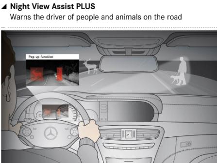 Система ночного видения Night View Assist Plus, предлагаемая в качестве дополнительного оборудования. Её инфракрасная видеокамера в условиях темноты снимает всю зону дальнего освещения и отображает это на центральном дисплее комбинации приборов. Причём пешеходы распознаются автоматически и на дисплее специально выделяются. Таким образом, даже в условиях плохой видимости люди, животные и предметы распознаются лучше.