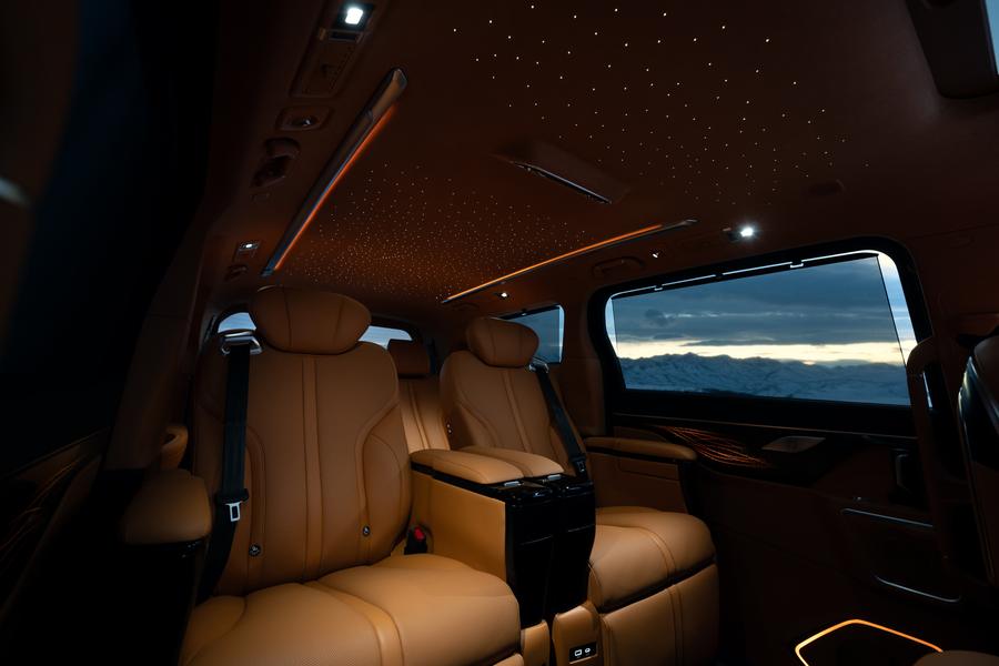Когда немного отвлекаешься от хрома, становятся заметны его размеры. А они, к слову, достаточно внушительные: 5045 мм в базовой версии рассчитанной на 7 мест под названием Premium. На вершине линейки разместился колосс Business Lounge. Длина такой машины составляет 5405 мм, а в салоне шесть посадочных мест: именно такой вэн побывал на тесте Quto.ru. Впрочем, слишком грузным шаттл не выглядит.