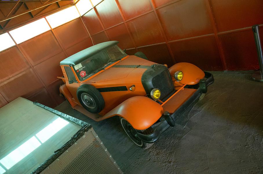 На улице под навесом вы увидите кузов, созданный братьями Щербиниными и братьями Алгебраистовыми, получивший имя Сатана. Было сделано 12 экземпляров такого кузова в различных вариантах: десять Гран Туризмо, один седан и один универсал. В одном из ангаров музея стоит Сатана в варианте Гран Туризмо – этот автомобиль снимался вместе с ЮНОЙ в фильме «Испытатели» 1987 года. Рядом с ним Регина – один из автомобилей серии Меркурий.